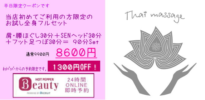 期間限定キャンペーン|大和高田市リラックル 2026.01.042026.01.13 期間限定キャンペーン リラックルに初めてご来店の方にお試し価格でご提供しています。サロンの雰囲気などお試しいただければと思います。*ご来店後にGoogleのレビューにご感想の投稿をお願いしています。 うつ伏せで上半身をしっかりほぐした後にヘッドセラピーで整えます。*タイ古式のストレッチはありません。 90分間でヘッドセラピー、フットマッサージがセットになっています。 ONLINE予約
